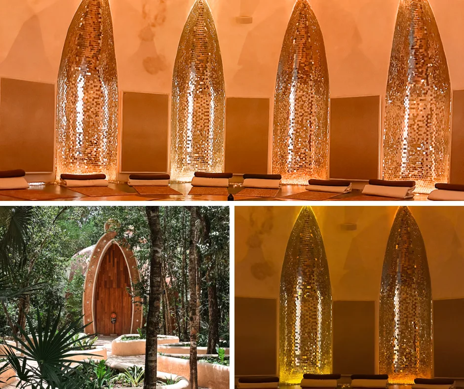 This is the Domo at Holistika, Tulum Mexico. The top and right side photos are the interior, bottom left is the doorway into the Domo.